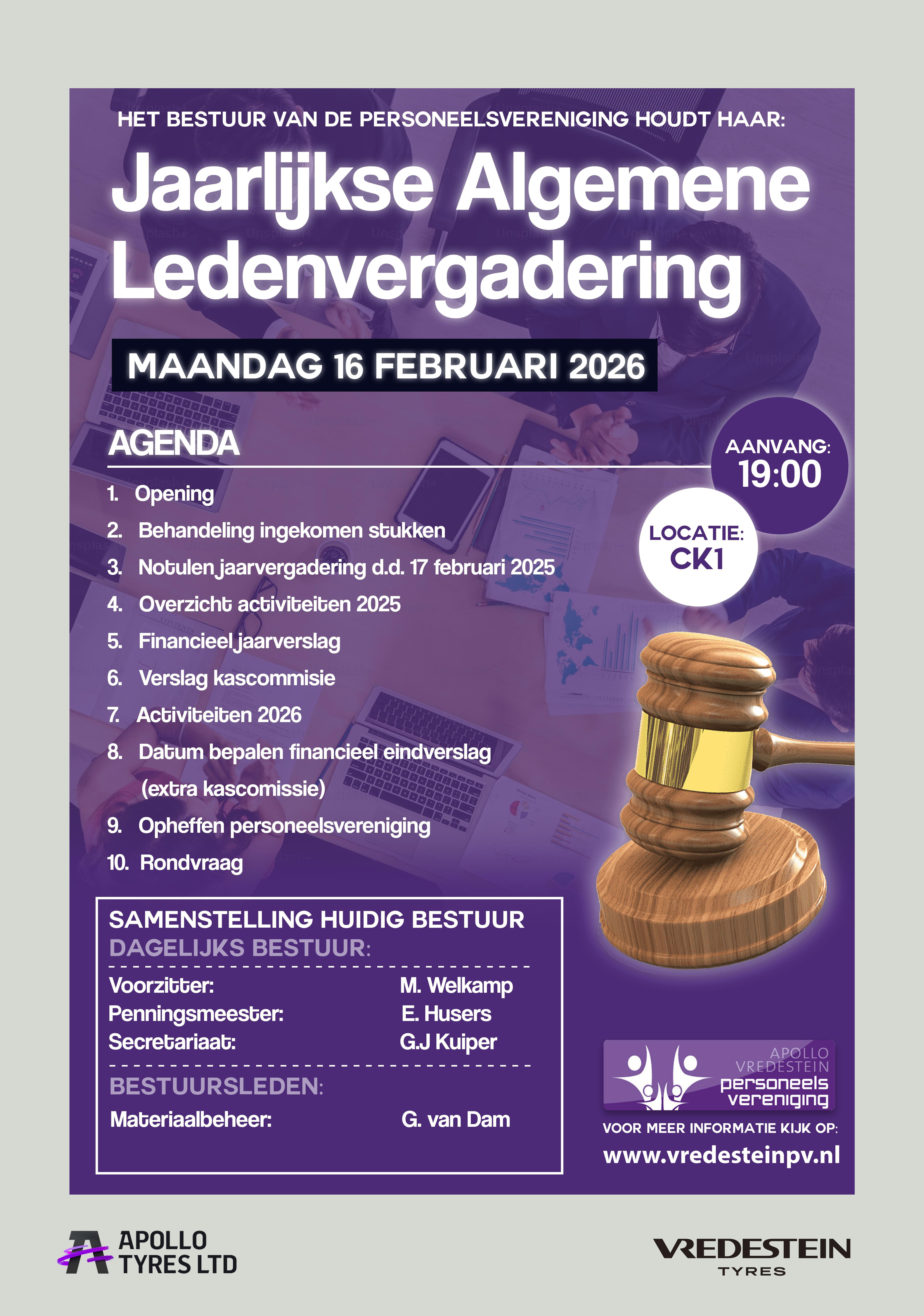 Het bestuur van de Personeelsvereniging Vredestein houdt haar Jaarlijkse Algemene Ledenvergadering. klik op de flyer voor een vergroting